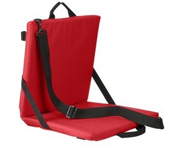 600-denier polyester; Comfortable stadium seat with adjustable side buckle straps for comfort; Elastic band to secure to bleachers; Back panel with zippered pocket for quick storage; Double carrying handles, adjustable, detachable shoulder straps for easy and comfortable carrying