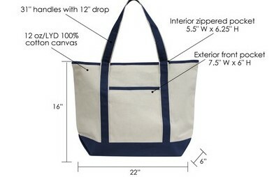 Promotional heavyweight large beach tote bag. Made of 12oz cotton canvas material. Interior zippered pocket, exterior front pocket, and 28" handles. Size is 22" x 16" x 6". This bag is great for the beach, pools, storing accessories, travel, weddings, and retail boutiques. 22" L x 16" H x 6" D