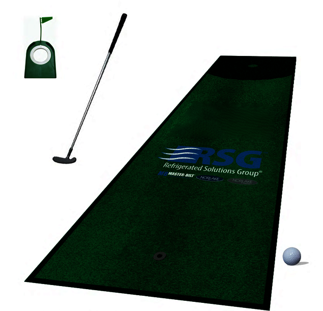 The Golf Game mat measures 30" x 84" and is made of high-quality astroturf that is built to last, ensuring that you can use it for years to come. The entire mat is customizable, and we offer several templates. The set is paired with a 35" putter, a putting cup, and a standard sized golf ball.