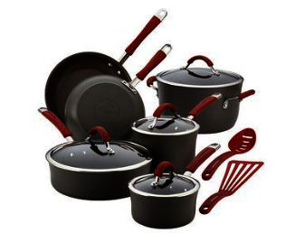 Enhance the cooking experience with the durable, artisan-styled pots and pans in the Rachael Ray Cucina Hard-Anodized Nonstick 12-Piece Cookware Set. Sturdily crafted from hard-anodized aluminum, the attractive rustic, modern cookware provides fast, even heating, helping to reduce hot spots that can burn foods. Set Includes: 1-Quart & 2-Quart Covered Saucepans, 6-Quart Covered Stockpot, 8-1/2-Inch & 10-Inch Skillets, 3-Quart Covered Saute Pan, Slotted Nylon Turner and Spoon. Color: Red
