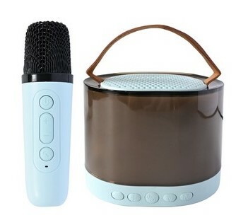 A sleek, arc-shaped design featuring a 360-degree transparent casing that's compact yet exquisitely detailed. Equipped with a wireless handle microphone, this speaker emits vibrant, colorful lights for an immersive atmosphere. Premium leather handle for easy portability. 4 3/8" W x 3 3/8" H