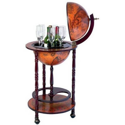 The 17.5 diameter wine globe displays your favorite wine and best glasses in a stately, old-world charm. The outside of the globe features an old-world nautical map finish with an integrated dark brown wood holder and table stand. The stand has antique wood finish, hardware cap, detailed feet, and the globe opens completely to reveal the inside. The wine and glass contents in the image are not included. This wine stand is a great addition to any home office thanks to its unique, elegant des